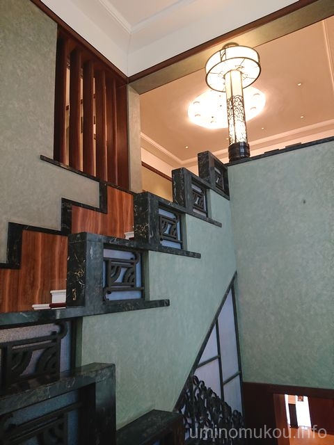 この第一階段は宮内省内匠寮の設計なのですが、階段手すり部分の装飾はフランスのデザイナーとはちょっと異なる日本独特の和柄のパターンのようにも見えます。