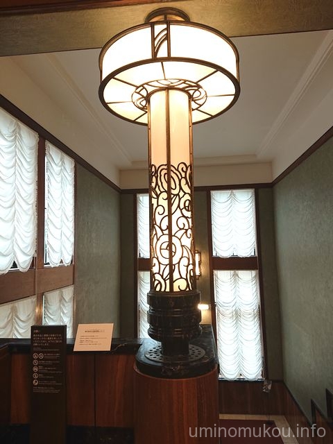 階段を上るとすぐにあるのは照明柱。こちらも宮内省内匠寮の作品で、バラの花柄で飾られています。